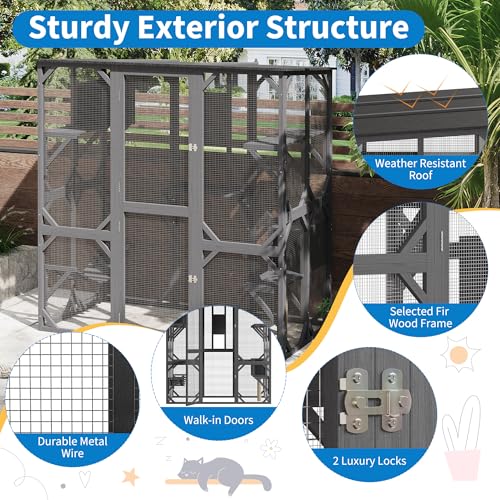 70 Inch Large Walk-in Catio Outdoor Cat Enclosure with Window Access, Cats Patio with Weatherproof Roof, 2 Napping Resting Box, Hammock and Scratching Post Dark Grey