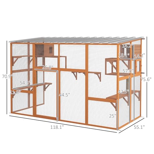 - Window Catio Info: Overall Dimensions (Without Roof): 118" W x 55" D x 75.5" H. Suitable for up to five cats, each up to 10 lbs. Assembly Required.