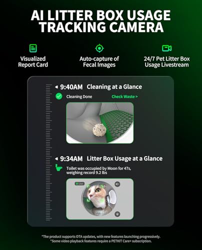- Artificial Intelligence Camera: PETKIT Max Pro self-cleaning cat litter box is equipped with a high-resolution AI camera with 210° wide angle and infrared night vision, which can be controlled remotely and live streamed in real time through the app, with 2.4&5GHz Wi-Fi enabled; the camera comes with a pet identification function, clearly captures the details of the cat's toileting, and focuses on recording the cat's urination and defecation data, help cat owners to determine the cat's health condition and prevent it in advance.