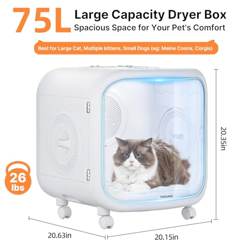 - Designed for Larger Capacity and Comfort: the spacious 75L large capacity dog dryer (measuring 19.7"×14.6"×16.2") comfortably accommodates multiple pets, with capacity for large cat (Maine Coons) or two to three kitten simultaneously or small dogs like Corgis weighing up to 45 pounds. The curved tempered glass door increases space by 17%, offering a wide view, and automatically open the door after drying, while the 4500K veterinary-grade lighting system ensures gentle illumination that won't distress your pet.