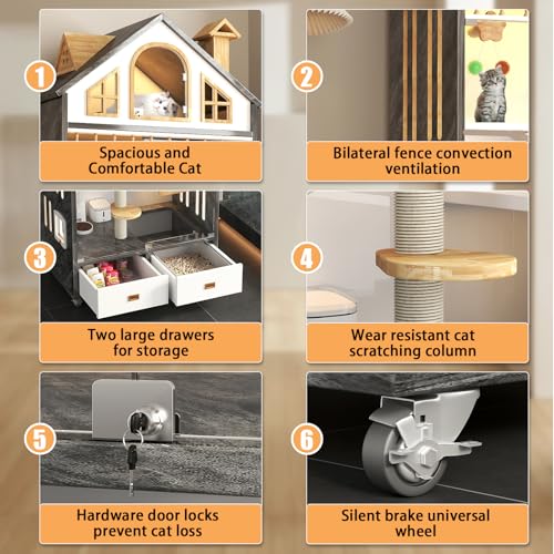 Wooden Cat House Indoor Cats Villa on Wheels, Large Space Cat Cage with Scratching Post, Multi-Feature Enclosed Cat Condo with Cat Litter Box Drawer, 63" X 35" X 24"